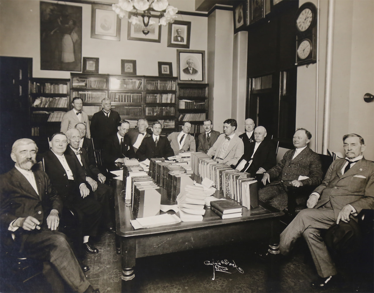 Wonderful photo, but I really don’t think it’s from the 1870s. Judging by the style of the men’s clothes and the apparent presence of electric lights, I’d put it solidly in the 20th century, probably 20s.